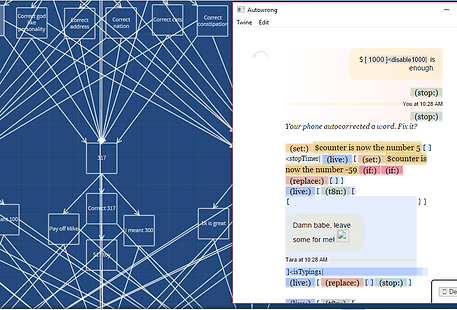 In this interactive narrative, I focused on re-creating the fear and anxiety of autocorrect sabotaging your intended messages. The timed autocorrect mechanic causes players to panic as they try to correct their responses in time before Tara reacts. The story is written so that the players would develop an emotional attachment to their fictional girlfriend, and would try their hardest to not ruin their loving relationship. Autocorrect is proven to be a dangerous and sensitive obstacle that players will learn to accept and overcome through morals and trust.